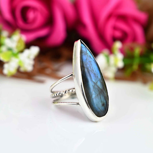 ✦••✧••✦••✧••✦••✧••✦••✧••✦ 》D E T A I L S《 ✦Stone :- Labrodite ✦Stone Size:-12x25 MM ✦Stone Shape:- Pear ✦Stone Type:- Natural ✦Metal:- Silver ✦Purty:- 925 Sterling Silver ✦Weight:- 8 Gram (Approx) ✦Ring Size:- All Size Available ✦••✧••✦••✧••✦••✧••✦••✧••✦ 》C U S T O M I Z E O R D E R《...